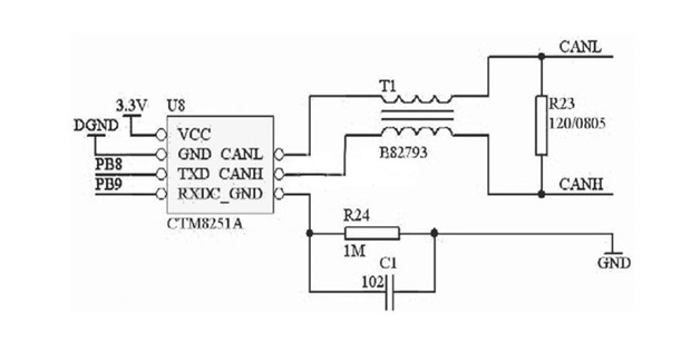 CAN-bus接口電路采用+3.3V供電,選擇CTM8251A隔離CAN收發器。該芯片是3.3V工業級的隔離CAN收發器。CTD0信號連接主控芯片的CAN控制器的發送腳,CRD0信號連接CAN控制器的接收腳。CTM隔離CAN收發器內有一完整的CAN-bus隔離收發器電路,可以將來自CAN控制器的邏輯電平轉換為CAN總線信號,并具有DC2500V隔離功能。另外,CTM收發器可以選擇集成ESD保護功能的“T”系列,從而省略外擴的ESD保護器件。共模扼流圈T1起著EMI增強的功能,用于提高設備的EMI能力;共模扼流圈T1的電感參數很重要,選擇CAN-bus專用器件,比如EPCOS的B82793扼流圈。
