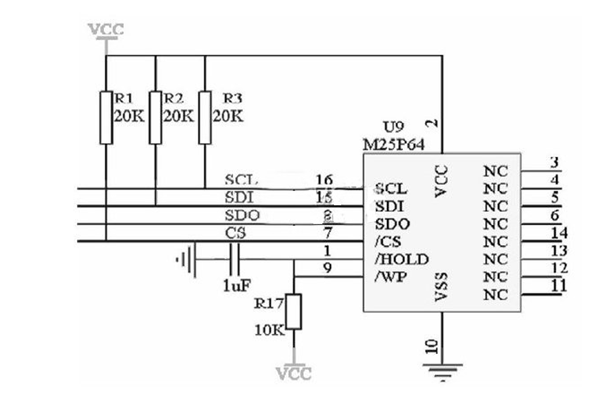 圖3為ARM與Flash的連接電路圖。以下幾點說明:(1)SCL串行時鐘信號,由主設備產生;(2)SDO主設備數據輸出,從設備數據輸入;(3)SDI主設備數據輸入,從設備數據輸出;(4)CS為片選,從設備使能信號,由主設備控制。(5)對7、15、16角外接上拉電阻,提高芯片輸入信號的噪聲容限增強抗干擾能力。