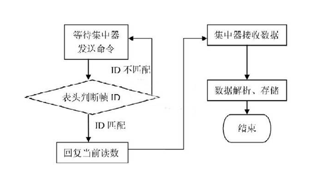 對時成功后,集中器繼續等待上位機的讀數命令或等待中斷讀數命令。當收到讀數的命令后,定時讀數使集中器按設置的時間,自動讀取表頭采集來的數據;讀數使集中器讀取當前表頭的數據。