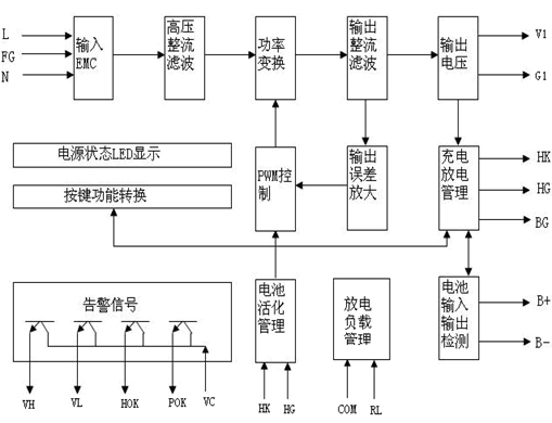 | 5.2.5電池的活化,當電池長時間處于浮充電狀態,應對電池進行活化以免電池極板鈍化,活化可以由外部CPU控制的繼電器把電源的活化端子HK、COM短接一次或手動短接HK、COM(不小于1秒,但最好不要超過5秒)電源進入活化狀態,電源關閉交流輸入,電池放電,當電池放電至活化完成點時,電源重新啟動工作向負載供電并為電池充電;如果電池需要提前退出活化,可以將HG端子對COM短接一次(不小于1秒,但最好不要超過5秒),電池自動退出出活化。 | |||||||||