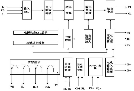 | 6.2.5 電池的活化,當(dāng)電池長時間處于浮充電狀態(tài),應(yīng)對電池進(jìn)行活化以免電池極板鈍化,活化可以由外部CPU控制的繼電器把電源的活化端子HK、V1-短接一次或手動短接HK、V1-(不小于1秒,但最好不要超過5秒)電源進(jìn)入活化狀態(tài),電源關(guān)閉交流輸入,電池放電,當(dāng)電池放電至活化完成點時,電源重新啟動工作向負(fù)載供電并為電池充電;如果電池需要提前退出活化,可以將HG端子對V1-短接一次(不小于1秒,但最好不要超過5秒),電池自動退出活化。 | |||||||||